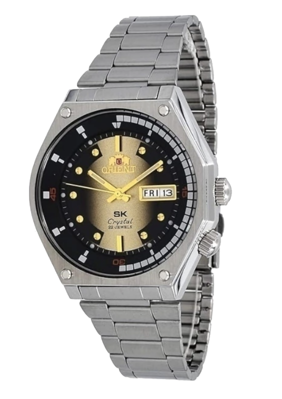 El Orient SK Diver RA-AA0B01G19A destaca por su diseño icónico con detalles dorados y un bisel interior giratorio que resalta su personalidad deportiva.